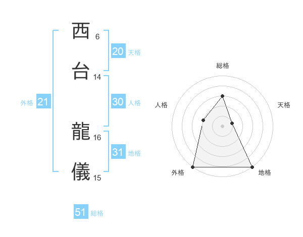 西台 龍儀さんの総格は51画の3点!