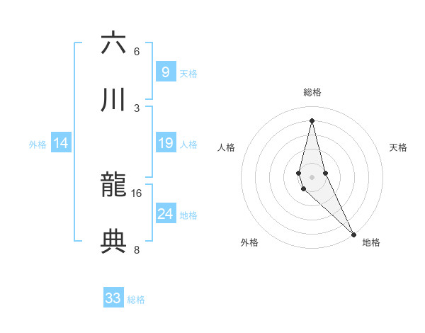 六川 龍典さんの総格は33画の4点!