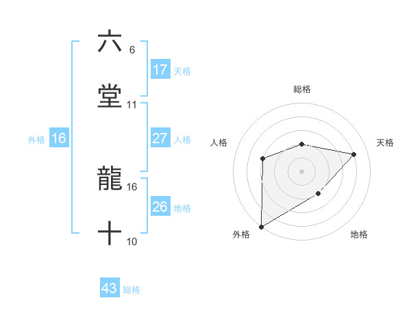 六堂 龍十さんの総格は43画の2点!