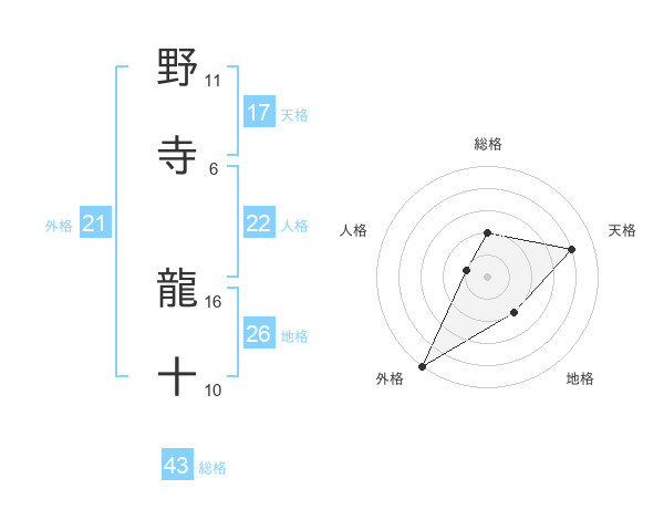 野寺 龍十さんを姓名の画数から五運を鑑定