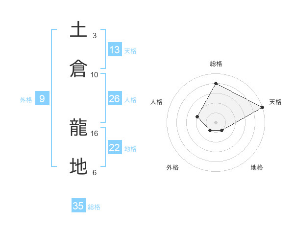 土倉 龍地さんを姓名の画数から五運を鑑定