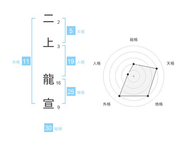 二上 龍宣さんを姓名の画数から五運を鑑定