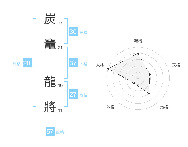 炭竈 龍將さんの総格は57画の4点!