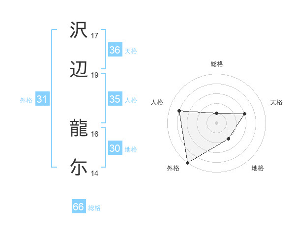 沢辺 龍尓さんの総格は66画の1点!