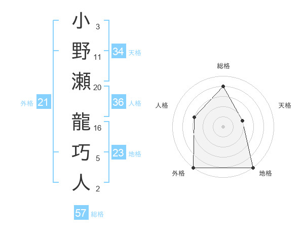 小野瀬 龍巧人さんの総格は57画の4点!