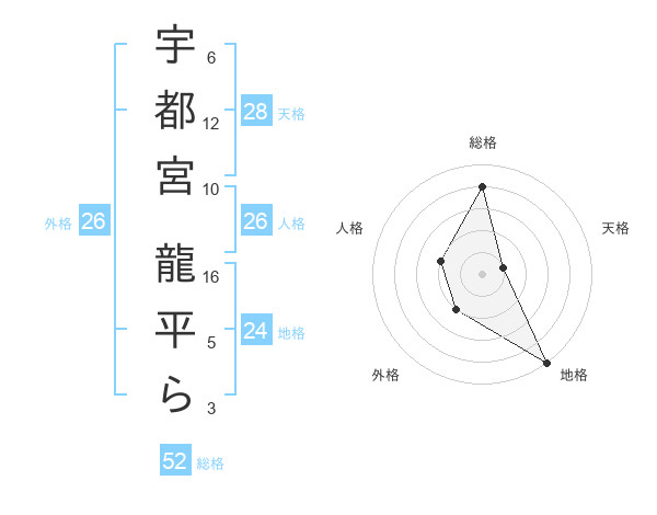 宇都宮 龍平らさんの総格は52画の4点!