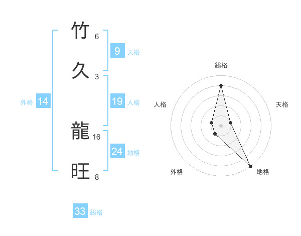 竹久 龍旺さんの総格は33画の4点!