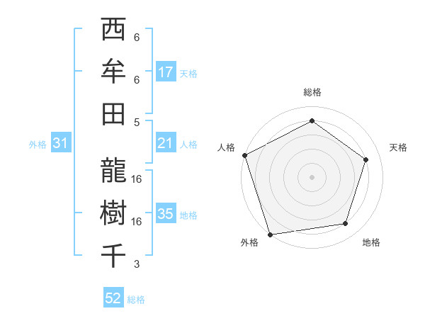 西牟田 龍樹千さんの総格は52画の4点!