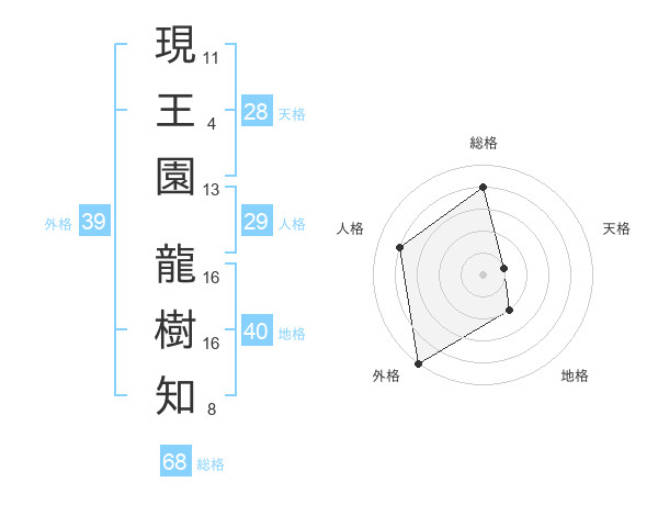 現王園 龍樹知さんの外格は39画の5点!