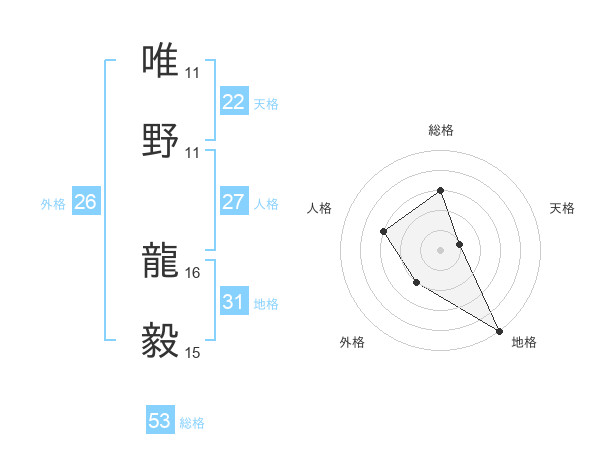 唯野 龍毅さんの総格は53画の3点!