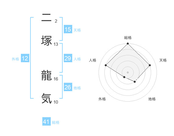 二塚 龍気さんを姓名の画数から五運を鑑定