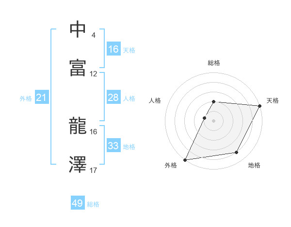 中富 龍澤さんの総格は49画の2点!