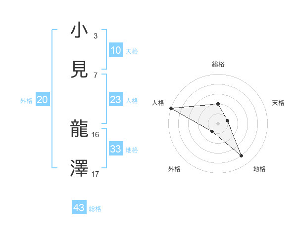 小見 龍澤さんの総格は43画の2点!