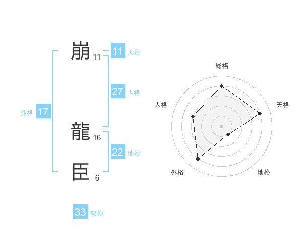 崩 龍臣さんを姓名の画数から五運を鑑定