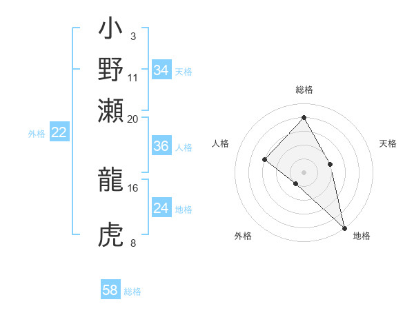 小野瀬 龍虎さんを姓名の画数から五運を鑑定