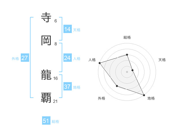 寺岡 龍覇さんを姓名の画数から五運を鑑定