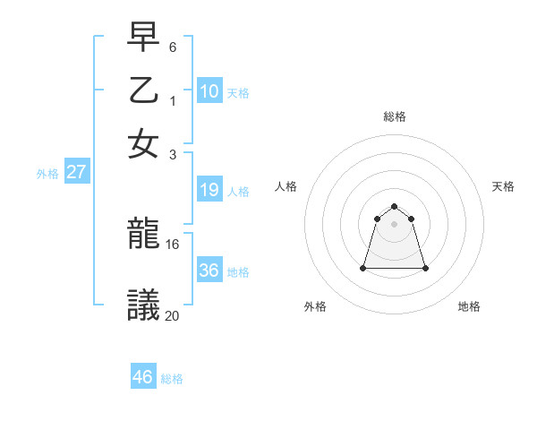 早乙女 龍議さんの総格は46画の1点!
