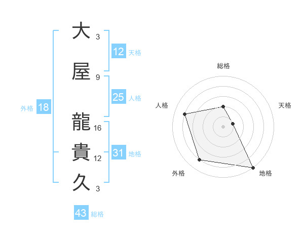 大屋 龍貴久さんを姓名の画数から五運を鑑定