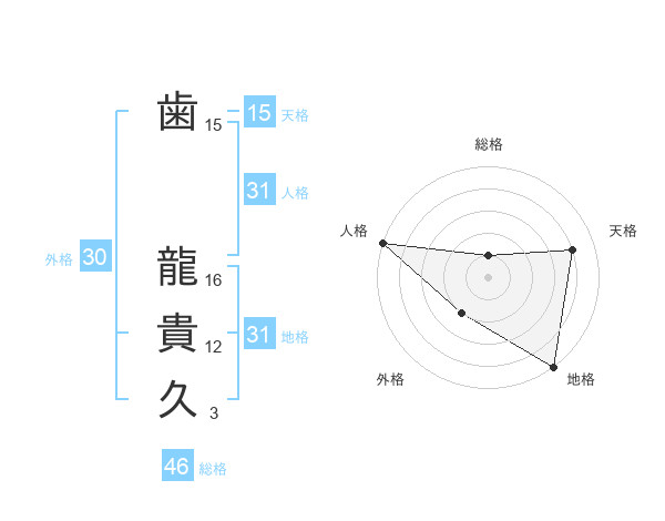 歯 龍貴久さんの天格は15画の4点!