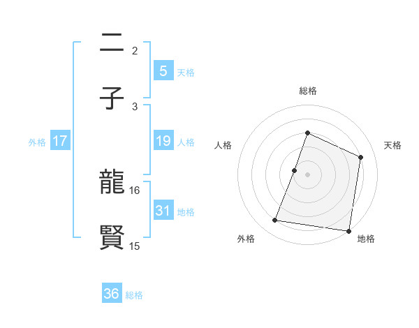 二子 龍賢さんの地格は31画の5点!