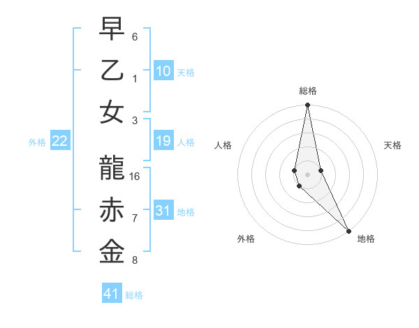 早乙女 龍赤金さんの総格は41画の5点!
