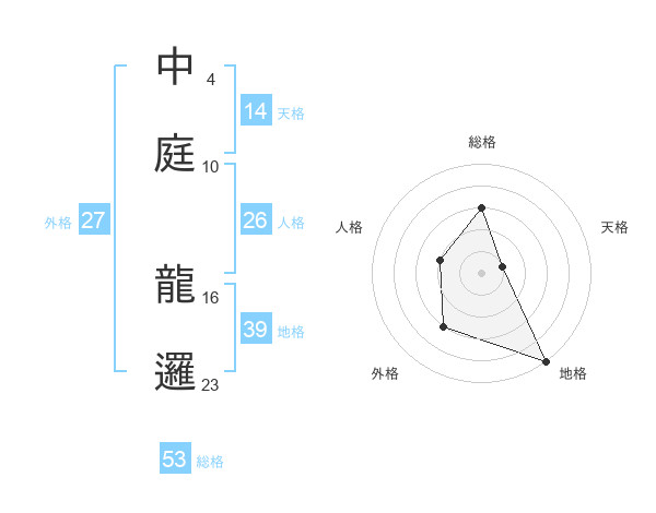 中庭 龍邏さんを姓名の画数から五運を鑑定