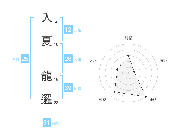 入夏 龍邏さんの総格は51画の3点!