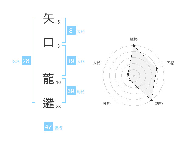 矢口 龍邏さんの総格は47画の5点!
