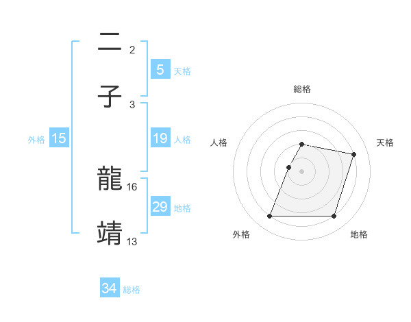 二子 龍靖さんの総格は34画の2点!
