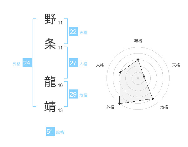 野条 龍靖さんの総格は51画の3点!