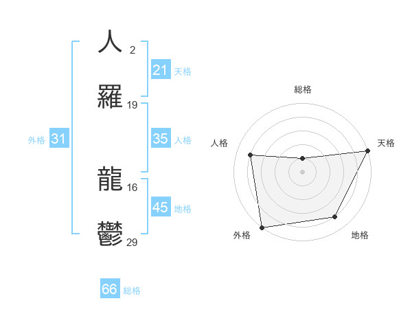 人羅 龍鬱さんの総格は66画の1点!