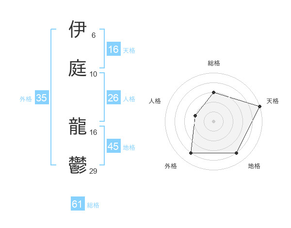 伊庭 龍鬱さんの総格は61画の3点!