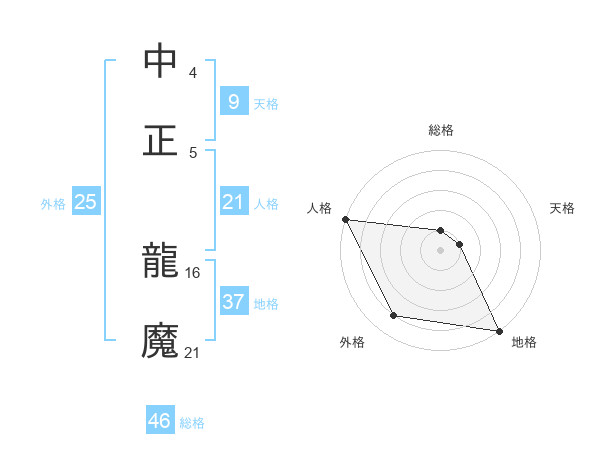 中正 龍魔さんの総格は46画の1点!