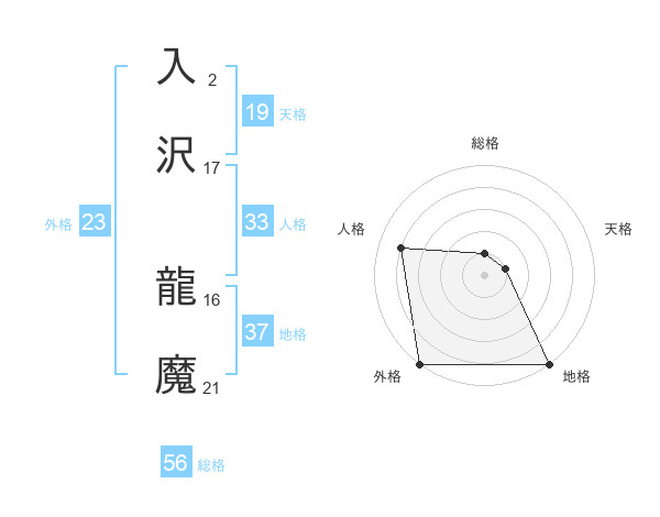 入沢 龍魔さんの外格は23画の5点!