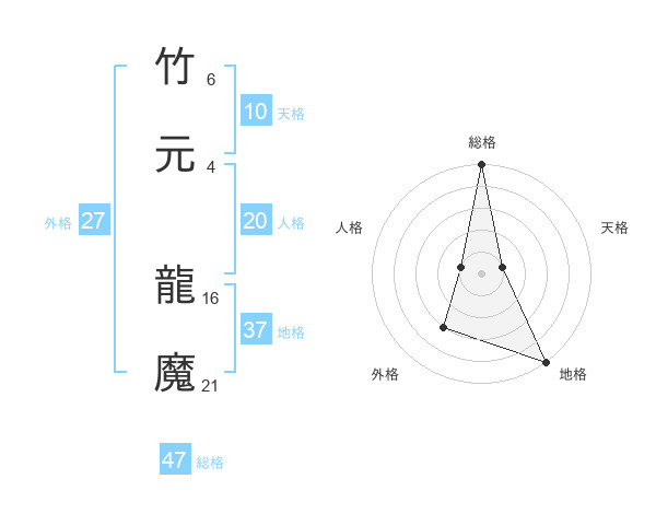 竹元 龍魔さんの総格は47画の5点!