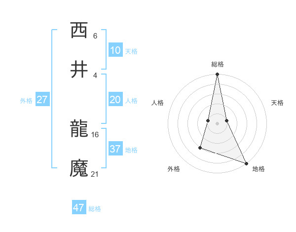 西井 龍魔さんを姓名の画数から五運を鑑定