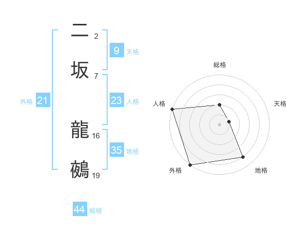 二坂 龍鵺さんの総格は44画の2点!