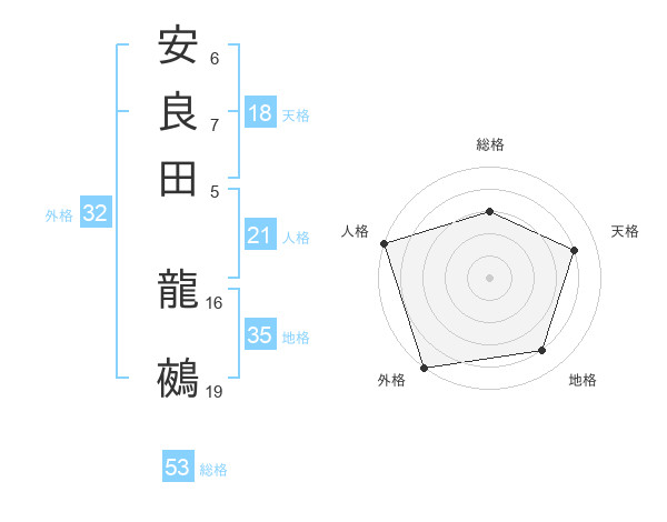 安良田 龍鵺さんの総格は53画の3点!