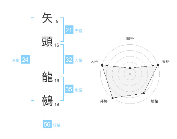 矢頭 龍鵺さんの総格は56画の1点!