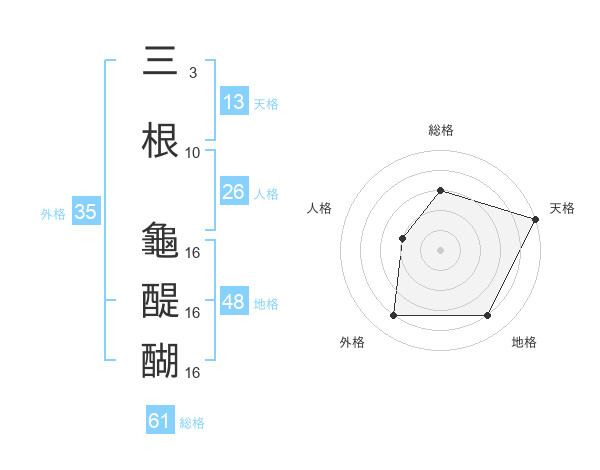 三根 龜醍醐さんを姓名の画数から五運を鑑定