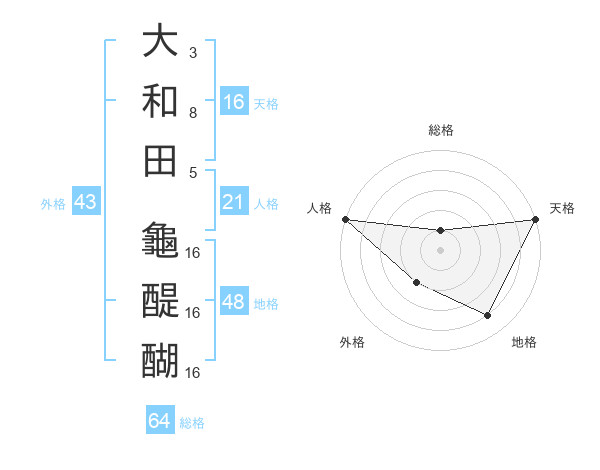 大和田 龜醍醐さんを姓名の画数から五運を鑑定