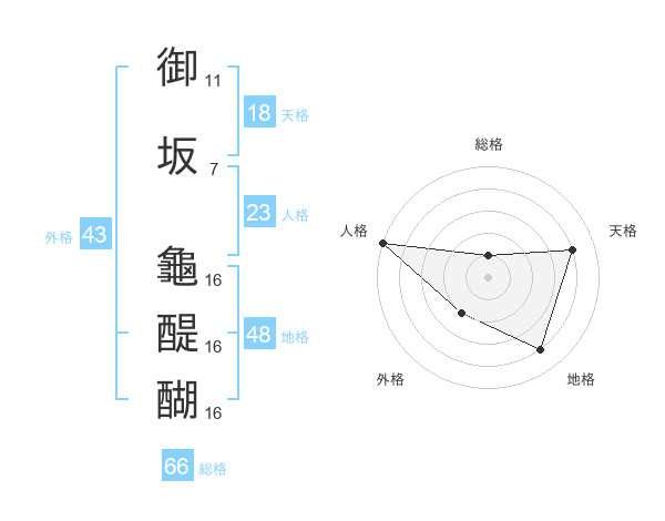 御坂 龜醍醐さんを姓名の画数から五運を鑑定